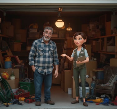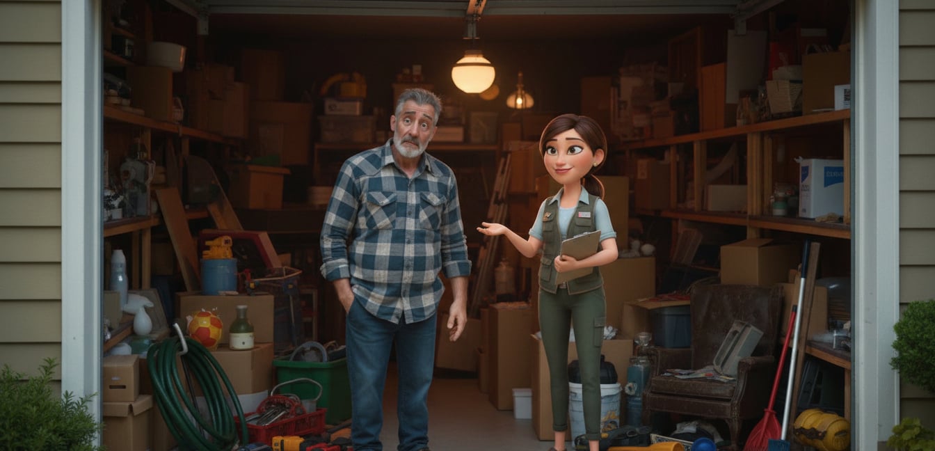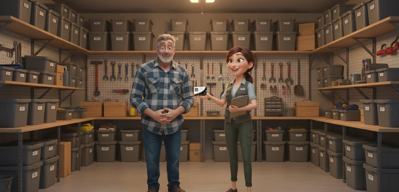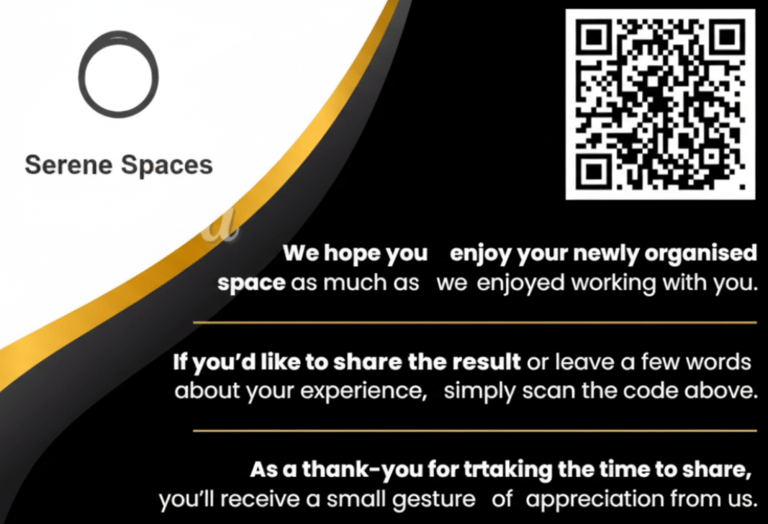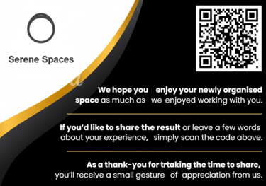 Example: A professional organiser hands over a Buddy Card at the end of a project — when a garage has shifted from overwhelming chaos to organised calm.